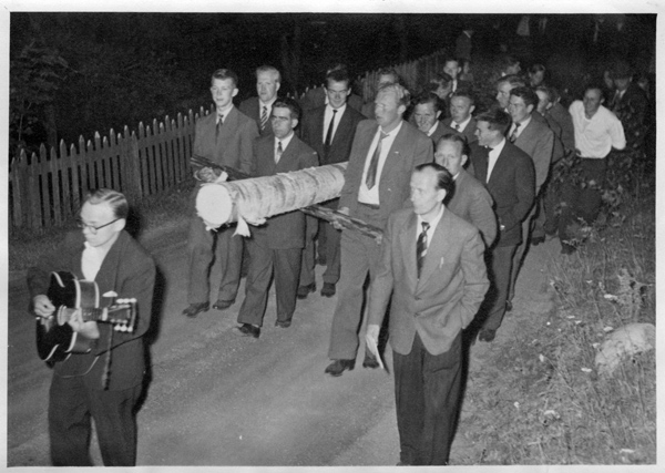 Bildtext: Ett lag med skogsplanterare i Odensviholm, 1956. Yngve Pettersson, Marianne Strömsten, Mary Karlsson, Erik Johansson, Kleverne, Valle Gustavsson, Gropen, Anders Gustavsson, Björksbo, Janne Gustavsson, Hybbel, Erik Gustavsson, Stockholm, Rune Karlsson, Gransjö, Gunnar Holmberg, Liberg, Lennart Karlsson, Spårebo och Lizzie Bergström längst fram till höger. Några namn saknas.