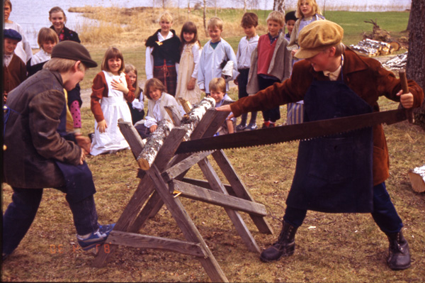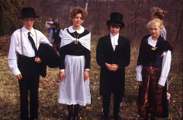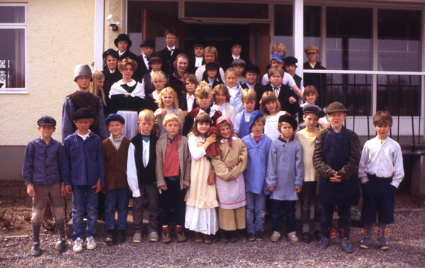 Bildtext: Evenemang med barnen i Odensvi skola där de är utklädda i gammaldags kläder. 30/4 1987. Några namn: Andreas Jakobsson, Christian Schäfer, Love Johansson, Ida Johansson, Jörgen Karlsson, Håkan Andersson, Johan Frithioff, Joakim Diener, Helena Kind, Diana Lagesson, Katarina Jakobsson, Jessica Svensson, Cecilia Adolfsson, Joakim Karlsson.