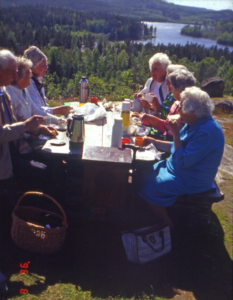 Bildtext: Fikapaus med fin utsikt på bussresan. Edit Andersson, Marianne Mårtensson m.fl. Bilden är tagen i Idhult, Oppeby församling, Östergötlands län