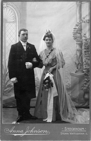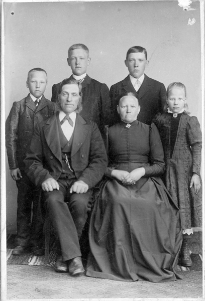 Bildtext: Anders Wilhelm Andersson, morbror till Carl Nilsson i Karrum, bodde i Bredhulthaga, Karrum. Här med hustru Matilda (Tilda) och barnen från vänster Melker (lantbrukare i Karrum), Severin (lantbrukare i Bredhulthaga), Axel (järnarbetare i Stockholm) och Edla gift med lantbrukaren Seth Karlsson i Mörtvik.