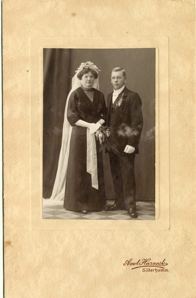 Bildtext: Bröllop mellan Edit och Ivar Gustavsson, Söderhamn. Johan Ivar Knut från Källarhult, f 13/1 1888 i Hallingeberg.