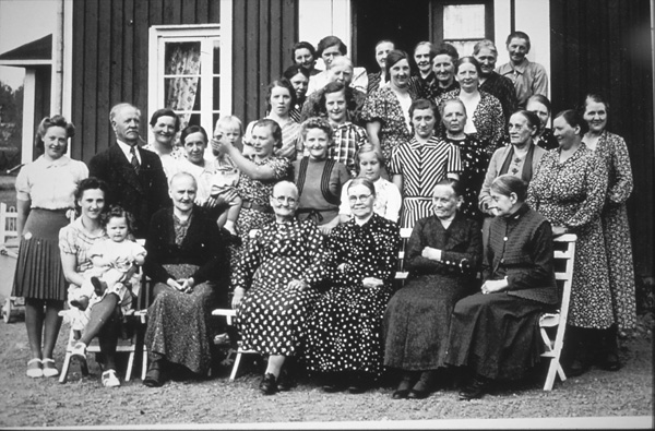 Bildtext: Symöte i Bredhultshaga ca 1943. Det är väldigt svårt att på denna bild se vem som är vem, därför har jag även delat upp denna i bild i flera olika där personerna är namngivna. 1. Britta i Brehultshaga 2. Elma Nilsson, Karrum 3. Birgitta Sundström (dotter till Elma) 4. Severin Andersson, Brehultshaga 5. Axelina Andersson, Brehultshaga 6. Gunhild Strid, Gröningstorp, maka till Gustav Strid. 7. Sofia Svensson i Karrum (Nisses mormor) 8. Troligen Nils Ove i affären i Torpa 9. Margit 10. Hulda Niklasson, Nyhaga (Axelinas mor) 11. Lisa i Solliden (senare Stenås) 12. Mia i Gröningstorp 13. Hele Johansson i Torpa som körde ut posten m cykel Karrum Ringsfall Odensvi t o r 14. Maja Nilsson, Enströmstorp 15. Josefina i Kvickhult 16. Gulli i Bredhulthaga 17. Inga i Bredhulthaga 18. faster Ida änka efter Adolf Ohlsson Karrum, senare omgift med skomakare Karlsson, affären i Torpa 19. Maj Nilsson dotter till Torian o Alice, Karrum. Kusin till Åke Nilsson. 20. Hulda Nilsson g m Karl August 21. Alice mor till Maj 22. Amanda Samuelsson, Wimanstorp 23. Ingrid Svensson, Karrum syster till Iris Lindersson 24. Okänd 25. Ida i Stenkullen 26. Ellen i Ringsfall, Set i Torpas mor 27. Okänd 28. Ester i Brehult 29. Emma i Torpa Fridhem 30. Mina i Torpa Karlsborg 31. Elise Nilsson, Karrum mor till Harald, hans, Gösta, Sture, Rickard, Svea ? 32. Sjöshult ? 33. Elin i Västra Bro svägerska till 34. Tant Gerda i Västra Bro