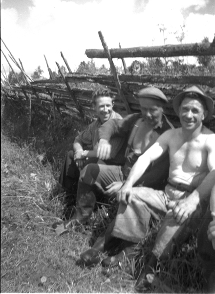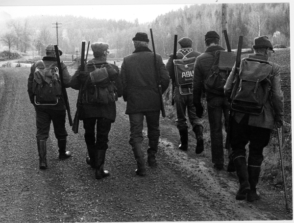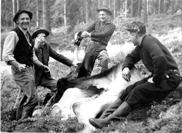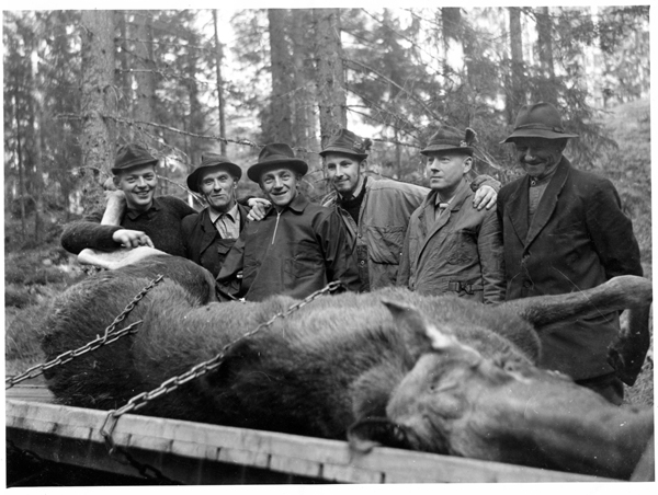 Bildtext: Älgjakt i Bockrödsle ca 1968. Från vänster Karl-Axel Gröning, Robert Andersson, Bockrödsle, Helmer Kling, Karl-Erik xxx, Gunnar Andersson, Odenskans och Axel Kling, Rössle.