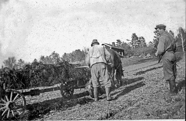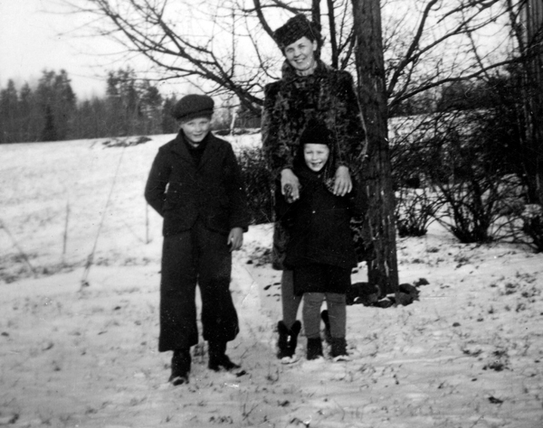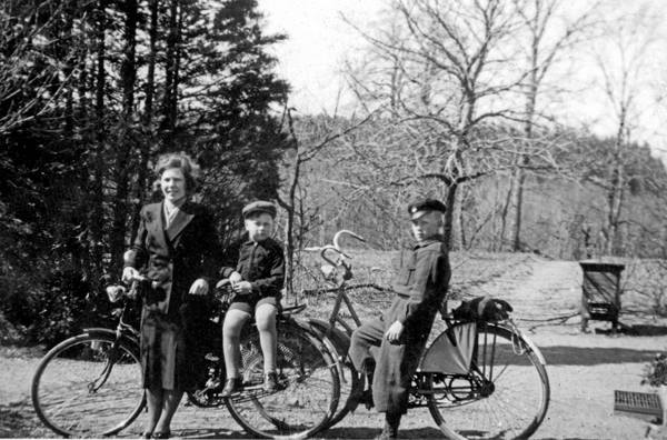 Bildtext: Bild från Bockrödsle. Kvinna med en mindre grabb på pakethållaren, den större cyklar själv även om cykeln ser ut att vara i största laget. Notera att bägge cyklarna har ekerskydd för att förhindra att någon passagerare får in en fot eller liknande i cykelhjulet. Bakom cyklarna syns en bikupa.