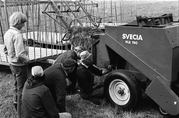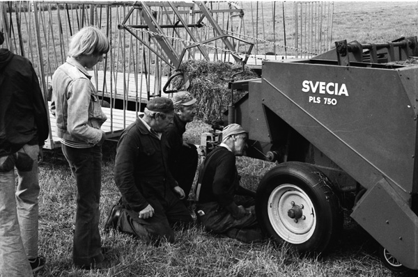 Bildtext: Hovslagare Danielsson motorfordon parkerad vid ladugården i Ogestad. En BMW Isetta, en mikrobil som tillverkades i ett par olika versioner under åren 1955 -62. Den var tvåsitsig, sittplatserna i bredd och in- och utstigning skedde genom att hela framsidan med vindrutan öppnades som en dörr. Hade till en början två tättsittande bakhjul och svenska myndigheter betraktade den pga. de fyra hjulen som bil, vilket bromsade försäljningen. Från 1959 kom den som trehjuling och registrerades då, i likhet med andra mikrobilar (Messerschmitt, Heinkel Kabine) mer gynnsamt som motorcykel och fick köras på mc-körkort. Drevs av en 300 cc motor på 13 hkr.
