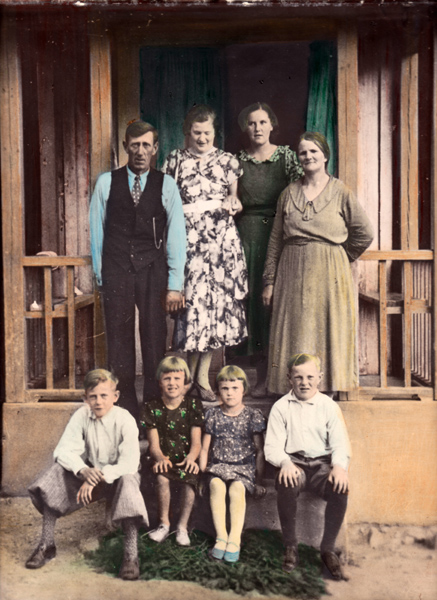 Oskar och Gerda Karlsson tillsammans med sex av deras barn på trappan till huset där de bor i Gursten, Lofta.