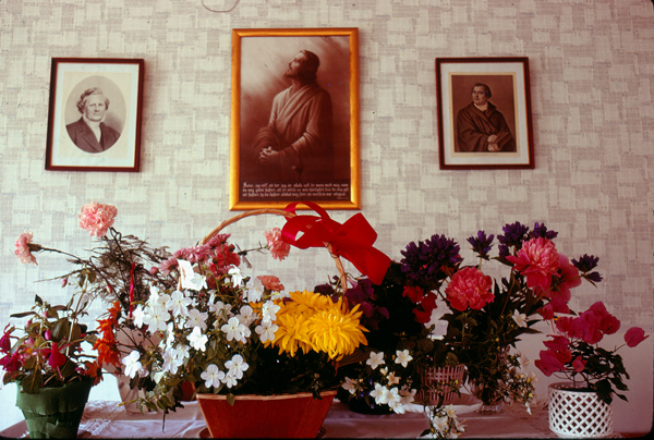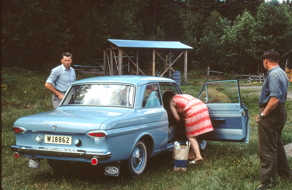 Bildtext: Sigvard Gustavssons bil Ford Anglia. Sigvard är uppvuxen i Skälhemslyckan, Källarhult där även bilden är tagen. På bilden syns även hustrun Maria och brodern Ragnar. Här packas för hemfärd till Mora. // Bilen är en Ford Taunus 12 M med typbeteckningen P4. Den var tysktillverkad 1962-66 och blev Fordkoncernens första framhjulsdrivna bil över huvud taget. Den drevs av en V4-motor, 1,5 l, 65 hkr, som först utvecklades för en amerikansk kompaktbil, ett projekt som emellertid inte fullföljdes. Bekant som drivkälla även i Saab 96. Bilen registrerad i Kopparbergs län (W), dvs i Dalarna.