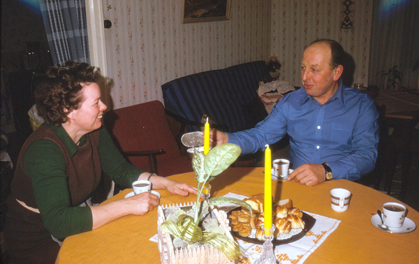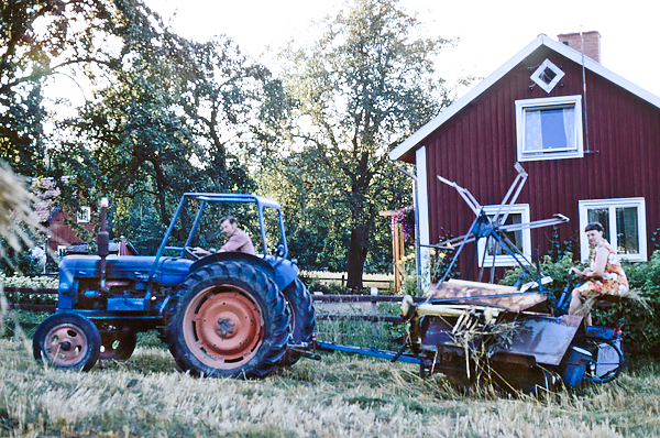 Bildtext: Skörd i Skälhemslyckan, Källarhult. Sigvard Gustafsson kör traktorn och hustrun Maris sitter på självbindaren. Traktorn är här, liksom på ett par andra bilder, en Fordson Major (Nya Fordson Major) som kom med förgasarmotor 1952, tillverkades till 1956, och som diesel 1952 till 1958.
