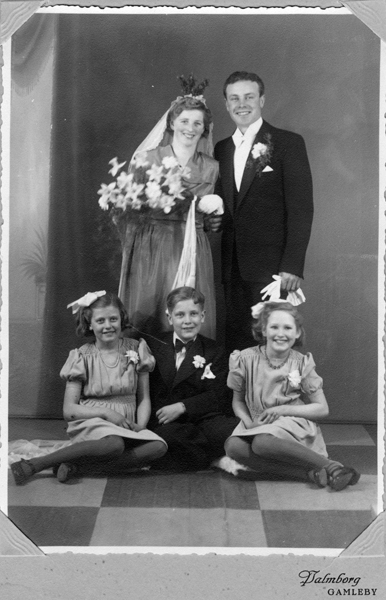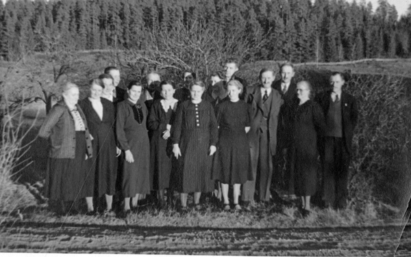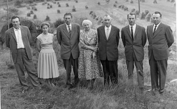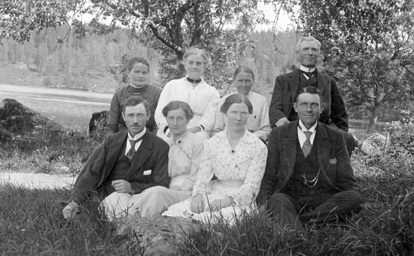 Bildtext: Sittande fr.v. Edvard Carlsson, Elsa Carlsson (född Lindén), Elsa Lindén o Alvin Carlsson. Stående F.V. Klara Carlsson, Sofie Jonsson, samt Anna o Karl Wilhelm Ludvig Jonsson (från Smältaretorp, föräldrar till Edvard och Alvin). Bild från Tretorp ca 1916.