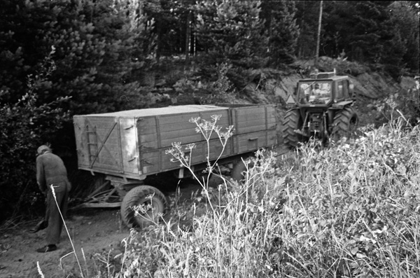 Bildtext: Jägarna samlas före jakt 831022, Ogestad. Från vä till hö : Stående Sven Johansson(Skarpinge), i bakluckan : Magnus Wall (Chicago), Sittande Gösta Swan, Stående : Ingrid-Märta Bröme. Sittande drickande med kaffemugg är osäkert, troligen en man med efternamnet Svanström /Nils-Erik Wall // Bilar första och tredje fr.v.: Volvo 145 eller 245, mellan dem en Peugeot 504.-- Bo Johansson