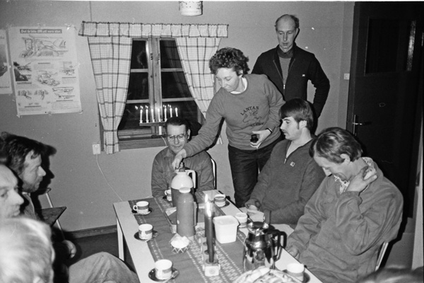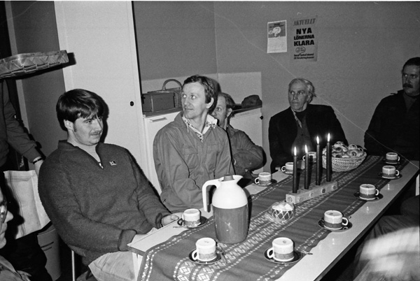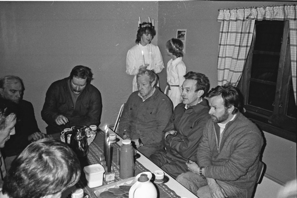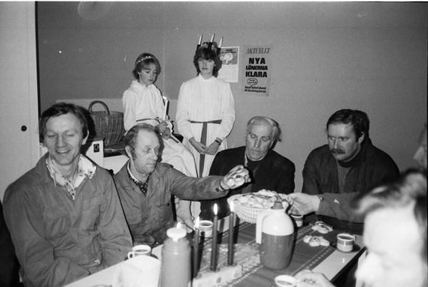 Bildtext: Luciamorgon i Ogestad. Gunnar Schäfer, Arne Kind, Bertil Haraldsson, Tage Nilsson, Caroline Bröme, Louise Bröme 831213
