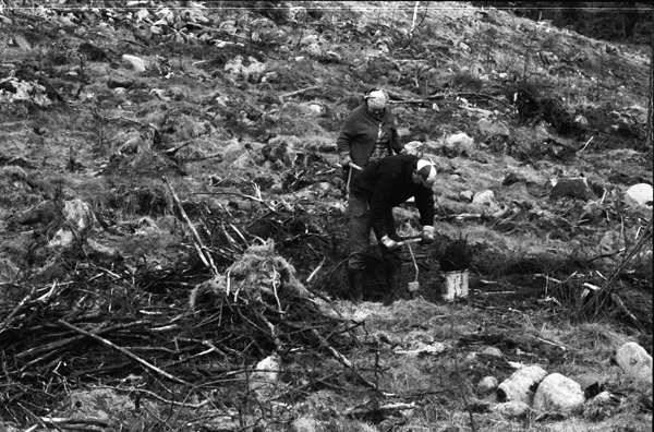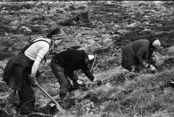 Bildtext: Plantering av skog på Skarpingen Lena Karlsson, Ebba Karlsson och Nils Zeylon 810506