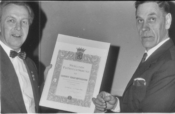 Bildtext: Odensvi Idrotts förening, OIF, firar 50 år. Fr. vä. 1:a Bror Karlsson, Snärsfall, nr 2 Sten Bergström, nr 3 Helge Bergström, nr 4 Ingvar Johansson, Solberget, 5:a Harald Larsson, Marieholm, 6:a