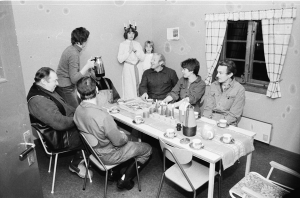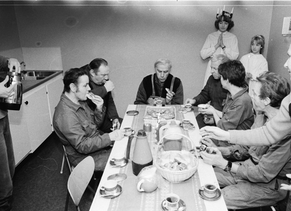 Bildtext: Luciamorgon i Ogestad ladugård. Louise Bröme och Caroline Bröme är Lucior 811213 Gunnar Forsberg, Kristin Hagström, Erik Johanson, Astor Bergqvist, Nils Karsson, Bertil Haradsson, Ingrid-Märta Bröme, Lars-Otto Bröme, Birgitta Bröme