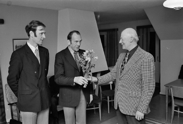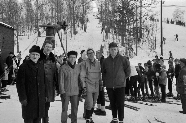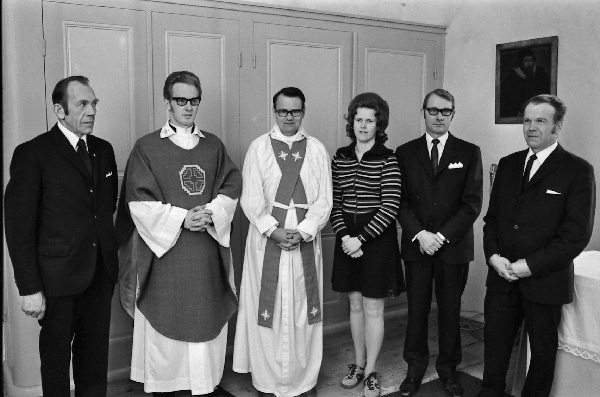 Bildtext: Kyrkoherde Olof Nilssons inträdespredikan 1973 Sven Svensson, Olof Nilsson, Sven Sand, Birgitta Nilsson, Hartvig Carlsson och Henry Svensson