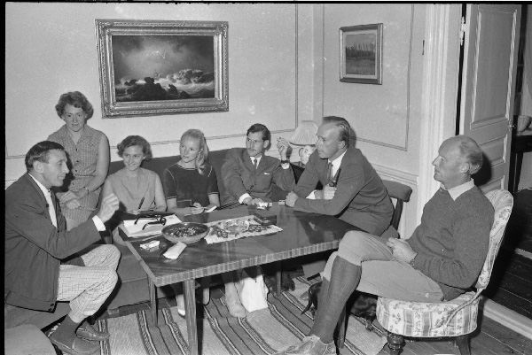 Bildtext: Moderaterna har möte på Odensviholm Holger Tunebjer, ombudsman från Vimmerby, Elisabet Fleetwood, Ingrid-Märta Bröme, Margareta Wirenfelt från Nygård, Håkan Persson från Ottinge, Sture Hummerhjelm från Casimirsborg, de tre sistnämnda från Lofta, samt Torbjörn Fleetwood Information om bilden från Bo Johansson