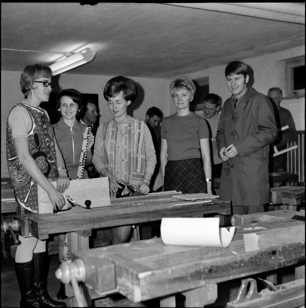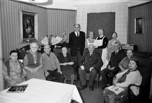 Bildtext: Skolfröken Maja Hansson med barn i kyrkan. Främre raden fr.v. Ulf Svensson (Ogestad), Kent Johansson (Snärsfall), Håkan Karlsson (Ogestad), Anders Carlsson (Odensvi).