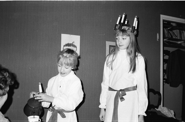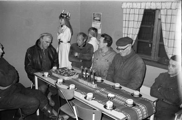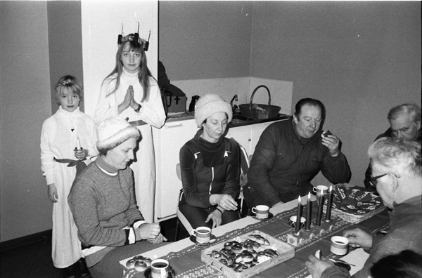 Bildtext: Röda Kors kaffe i pensionärshemmet 791215, Stående bakom ser ut att vara Ingegärd Andersson, Odensvi och