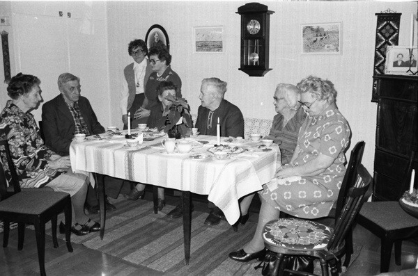 Sökord: RK ålderdomshemmet pensionärer gamla åldringar glasögon kaffekoppar tavlor väggur Motivkategori:förening Id:7234 Fotograf: Carl-Axel Bröme Fotoår: 1979 Bildnummer: CB7280 Förening: Odensvi hembygdsförening Land: SE Motivplats: Kalmar, Västervik, Odensvi, byn Teknik: Skannat sv/v negativ Rättighet: Originalplats: (visas ej publikt)