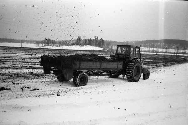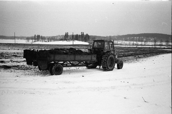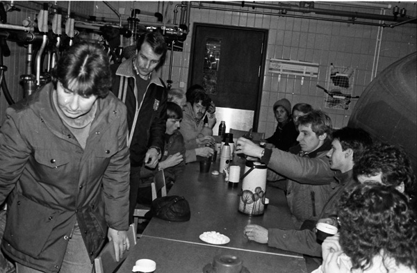 Bildtext: LRF avdelningen i Odensvi på besök i Odensviholms nya ladugård 840224. Kaffe o smörgås i mjölkrummet. Torbjörn Svensson, Skälhem, Inger Svensson, Göran Svensson, Odensviholm, Anders Bröme, Ogestad
