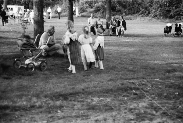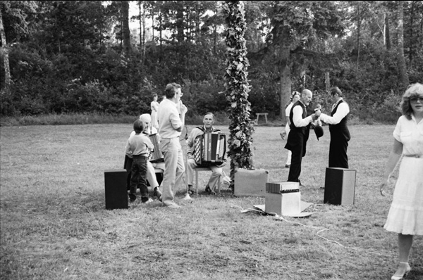Bildtext: Midsommarfirandet vid Kyrksjön 830624 Dragspelarna Gösta Linden och Lennart Möller. // Hallingebergs dansgille uppträdde vid det här midsommarfirandet, då paren dansade i s.k svartkläder, högtidskläder från 1900-talets början med bonjour och plommonstop rep. långa klänningar och olika hattar. Mannen med mikrofonen är dåvarande ledaren för dansgillet, Yngve Nilsson, även han skrudad för dans, men verkar för tillfället ha lagt av sig rocken för att få lite svalka-