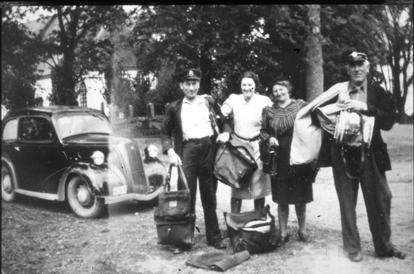 Bildtext: Bild från parkeringen vid Odensvi kyrka. Harry Johansson, Boda, postiljon, Fröken Elsa Stenberg föreståndare, Helga Johansson, Ludvigsborg, Karrum, postiljon, Helge Hyllman, Gamleby, postkörare. 1950-talet. // Bilen är en Ford Anglia 1938. Anglia var 2-dörrars medan Prefect alltid varit 4-dörrars. I övrigt hade de stora likheter under de här första årsmodellerna.