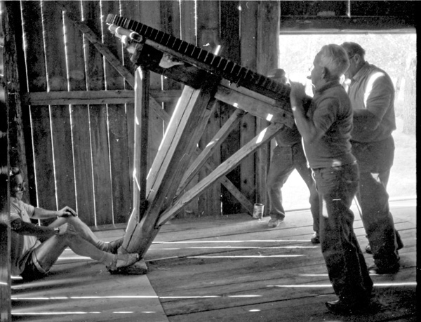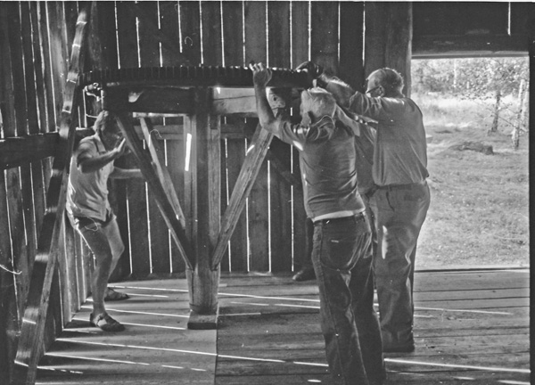Bildtext: Oxvandringen monteras upp i hembygdsparken i Odensvi. Kjell Mårtensson, Sven Johansson m.fl. 830831