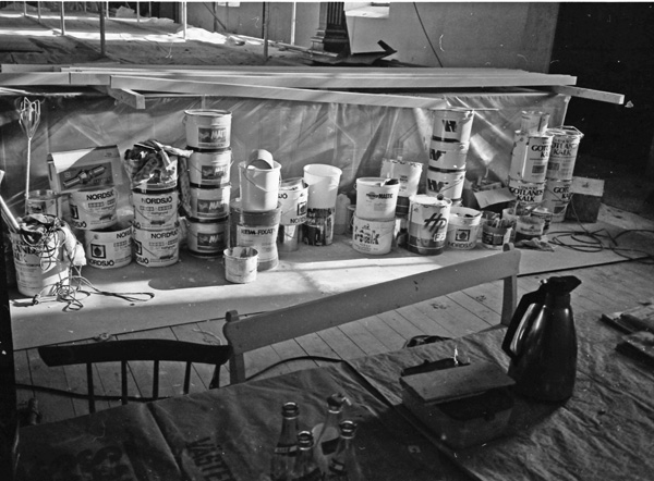 Bildtext: Jägarna samlas före jakt 831022, Ogestad. Från vä till hö : Stående Sven Johansson(Skarpinge), i bakluckan : Magnus Wall (Chicago), Sittande Gösta Swan, Stående : Ingrid-Märta Bröme. Sittande drickande med kaffemugg är osäkert, troligen en man med efternamnet Svanström /Nils-Erik Wall // Bilar första och tredje fr.v.: Volvo 145 eller 245, mellan dem en Peugeot 504.-- Bo Johansson