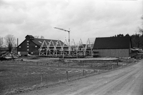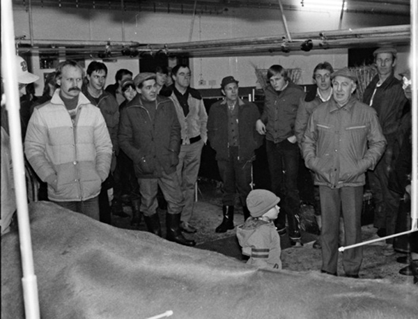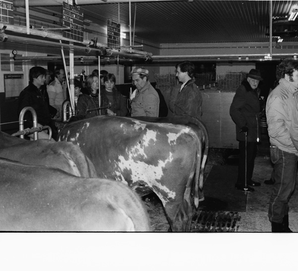 Bildtext: LRF avdelningen i Odensvi på besök i Odensviholms nya ladugård 840224. Till vänster Torgny Johansson. I mitten Allan Andersson, Mulestad, Tage Svensson, Torsten Karlsson och Börje Karlsson, Snärsfall. Till höger Olof Svensson, bakom syns Göran Svensson samt på hörnet Sven-Olof Hafström, Mulestad. --Informationen från Lena Andersson