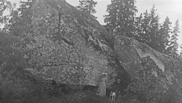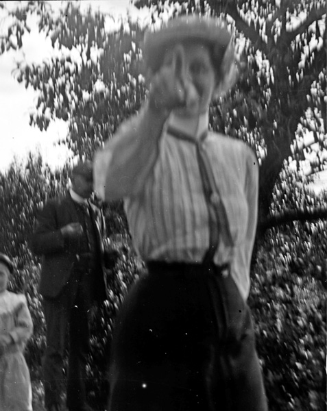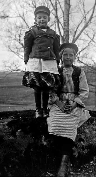 Bildtext: Detta är tyvärr inte hela bilden, ett tredje barn saknas. Elsa Pettersson, fru till Karl Svensson i Charlottenborg, senare bosatt i Sothem, Rumma. En gång arrendator i Kvisterum. Troligen är det hennes bröder som hon sitter mellan. Vet någon mer ?