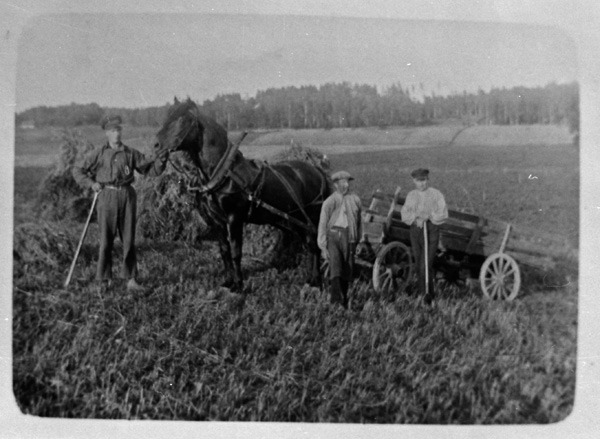 Sökord: häst djur kärra vagn höskörd högaffel Motivkategori:jordbruk Id:2398 Fotograf: Reprobild Carl-Axel Bröme, original okänd Fotoår: ca 1920 Bildnummer: CB_Repro_0122 Förening: Odensvi hembygdsförening Land: SE Motivplats: Kalmar, Västervik, Odensvi, Ogestad Teknik: avfotograferat originalfoto Rättighet: Originalplats: (visas ej publikt)