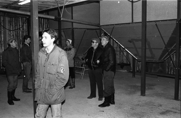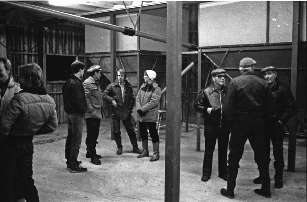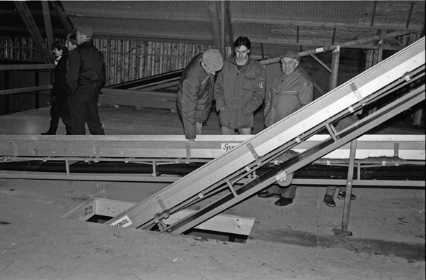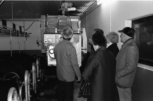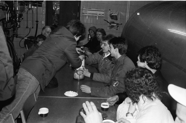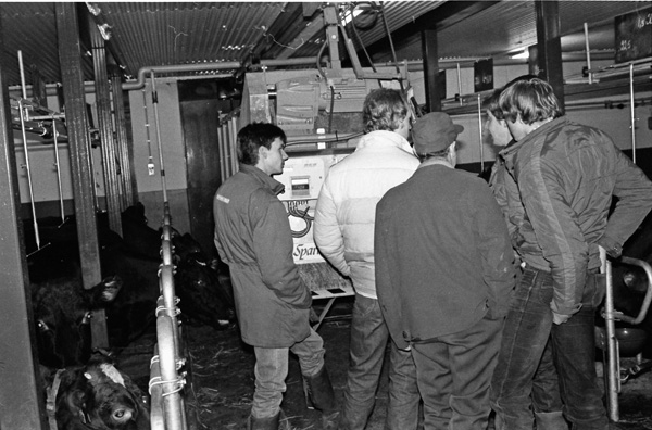 Bildtext: LRF avdelningen i Odensvi på besök i Odensviholms nya ladugård 840224. Kaffe o smörgås i mjölkrummet. Torbjörn Svensson, Skälhem, Inger Svensson, Göran Svensson, Odensviholm, Anders Bröme, Ogestad