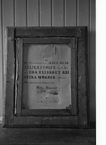 Bildtext: Renovering av Odensvi kyrka 840216. Tavla av Strussenfält i Odensvi kyrka. På baksidan av tavlan: Gåva till Axel Otto Liljenstolpe o Ida Mörner.
