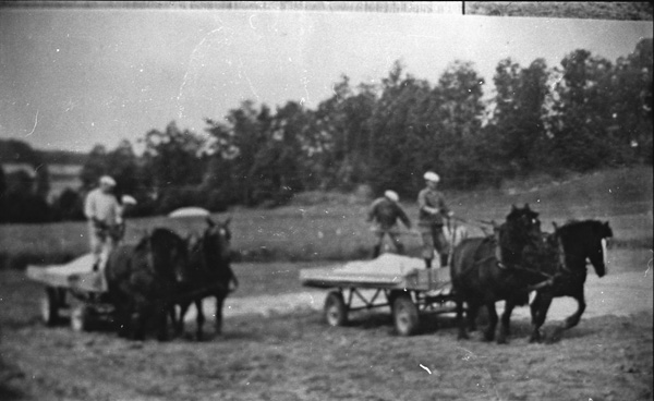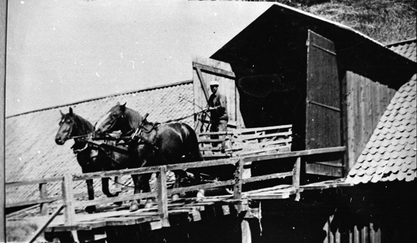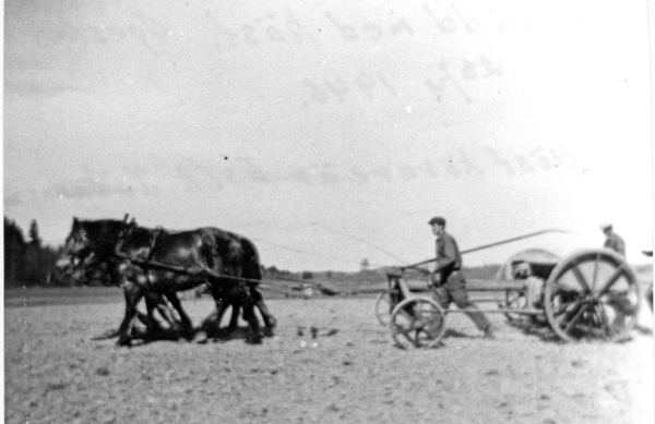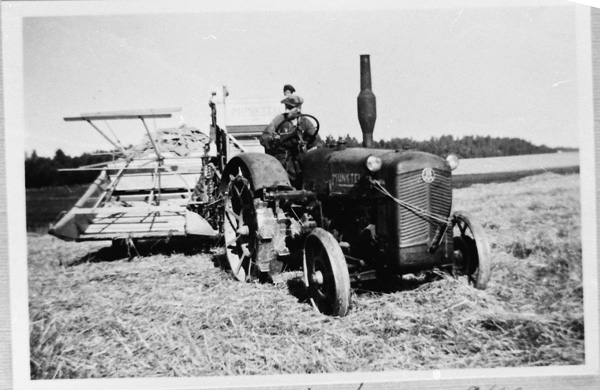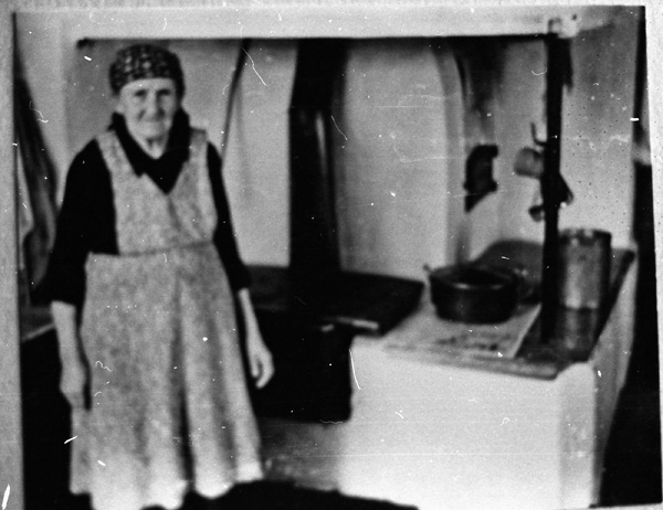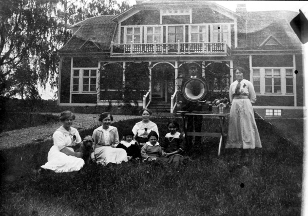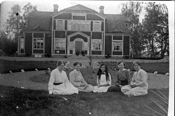 Bildtext: Avfotografering Eka, Ogestad. Eka brann ned på 1957. Från vänster, 1: okänd 2: Hildur Andersson Karlsson från Hjorted. 3: Lilla flickan är Valborg Wilén. 4: Anni Svensson Vilhelmsson, var på Eka 1918 som gift. 5: Emmy Olsson. På trappan i bakgrunden syns Emmie och Erik Liljenstolpe.