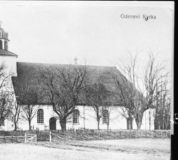 Bildtext: Vykort på Odensvi kyrka och samhälle.