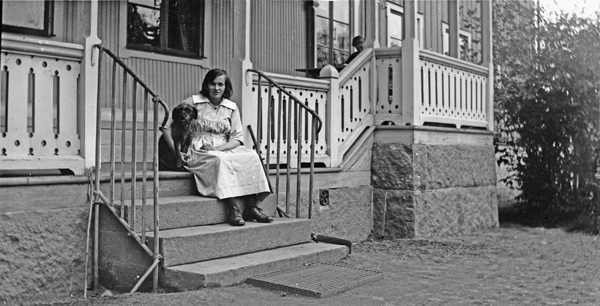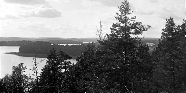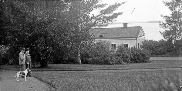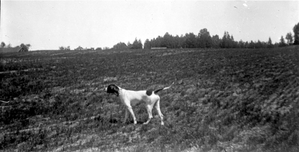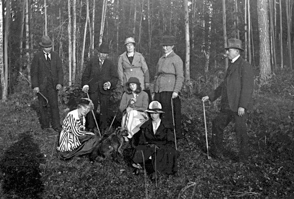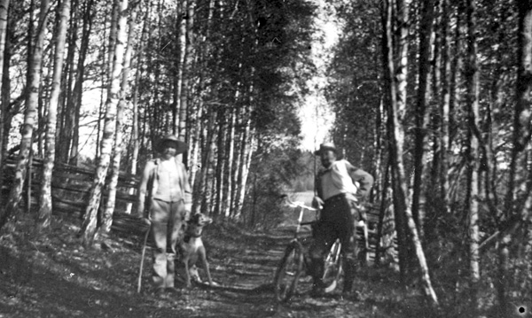 Bildtext: Bild från Ogestad. Två herrar bland björkar, en med hund och en med cykel. Vet någon vilka ?