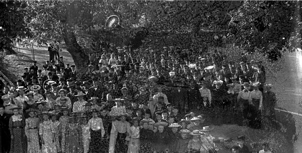 Bildtext: En stor samling med människor, troligen vid kyrkan.