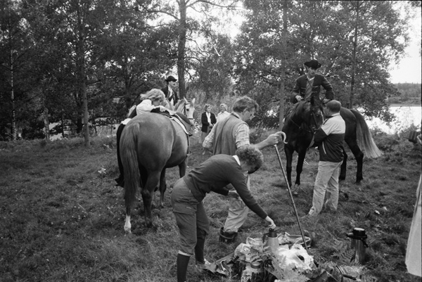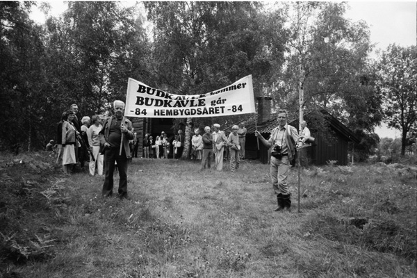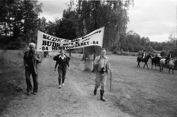 Bildtext: Budkavel 840617. Budkaveln hämtades på morgonen 840728 vid Slättfall i Blackstad för att sedan bäras till Odensvi via Tjustleden, ca13km. Deltagare vid marchen Ingrid-Märta Bröme, Kjell Mårtensson, Sven Johansson, Carl-Axel Bröme. I bakgrunden väntar Tomas Mårtensson, Annika Werner och Anders Bröme på att ta över till häst.