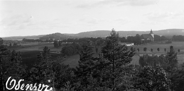 Bildtext: Bild från Hertzberg över Odensvi kyrka. Observera vilka byggnader som finns, förutom husen vid kyrkan syns husen i Enalund.