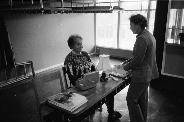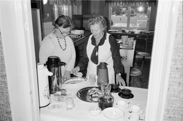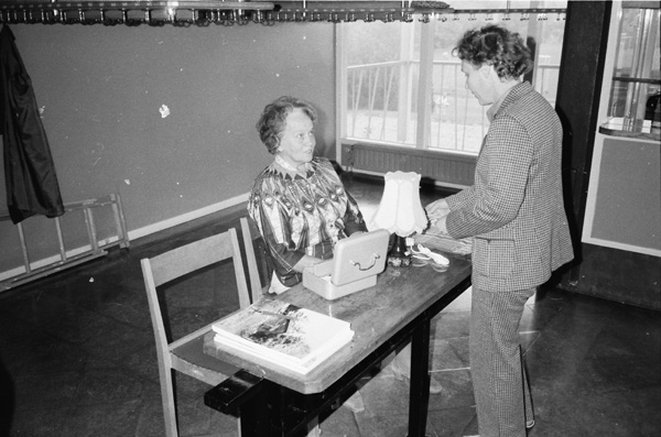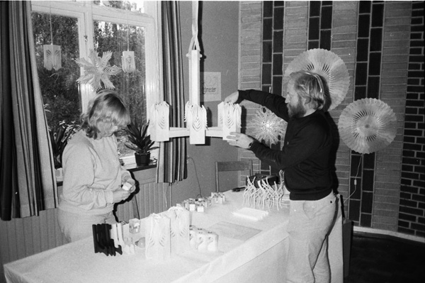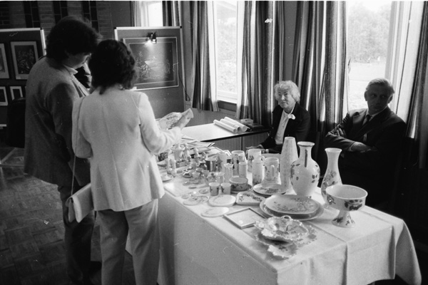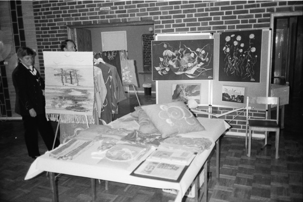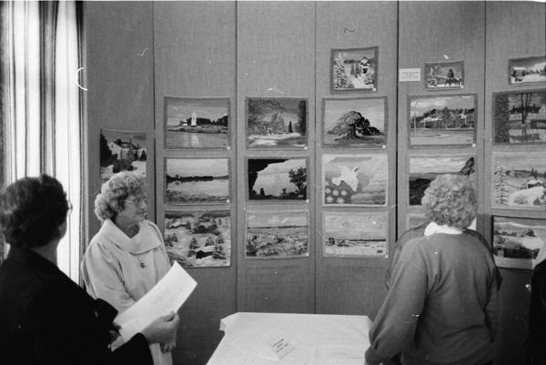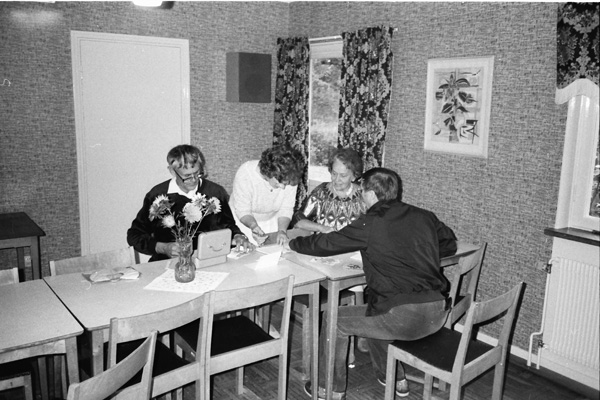 Bildtext: Konst och hantverksutställning i Odenskans 840915. Resultatet räknas samman av Helmer Svensson, Sonja Svensson, Rut Grönhammar och Åke Nilsson