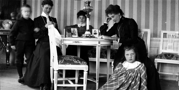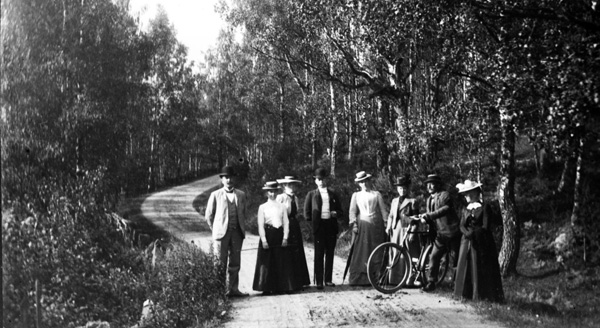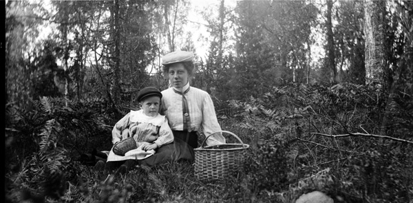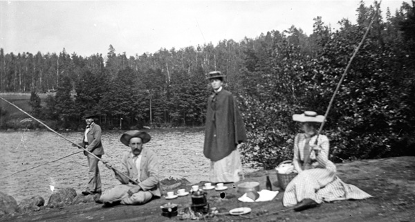 Bildtext: Ett sällskap ute och fiskar. I mitten syns,troligen, Axel Liljenstolpe och Mia Liljenstolpe.