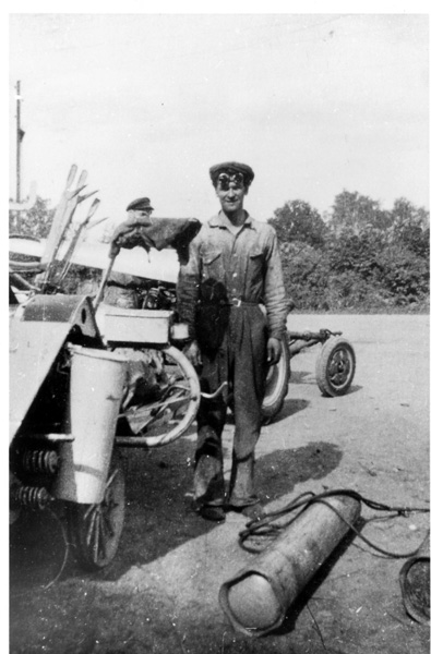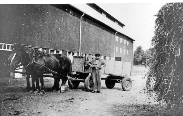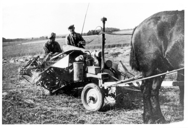 Bildtext: Reprobilder från Ogestads gårdsarkiv: Yngve Jakobsson och Lundberg jobbar med höstskörden med en stavhaspelbindare på Ogestad. // Traktor: IH Farmall A, ca 18 hkr, en s.k. offsettraktor där föraren satt på höger sida av motor och växellåda, som var förskjutna åt vänster så att huven inte hindrade förarens sikt framåt och ned mot utrymmet mellan fram- och bakhjul.