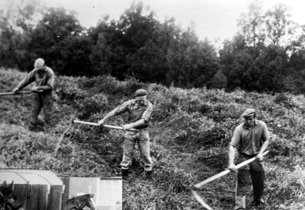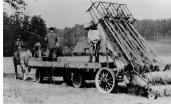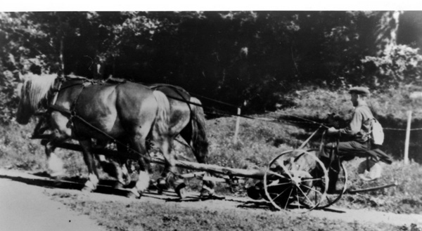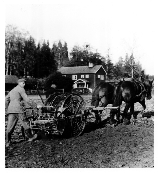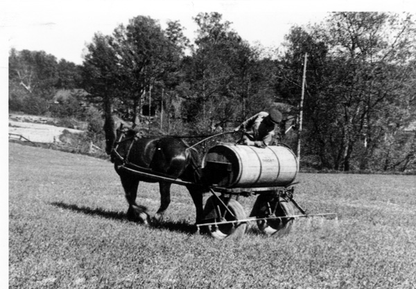 Bildtext: Reprobilder från Ogestads gårdsarkiv: Ogräsbeprutning, ”Fritz” Erik Nilsson kör den hästdragna ogrässprutan.