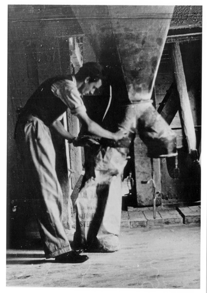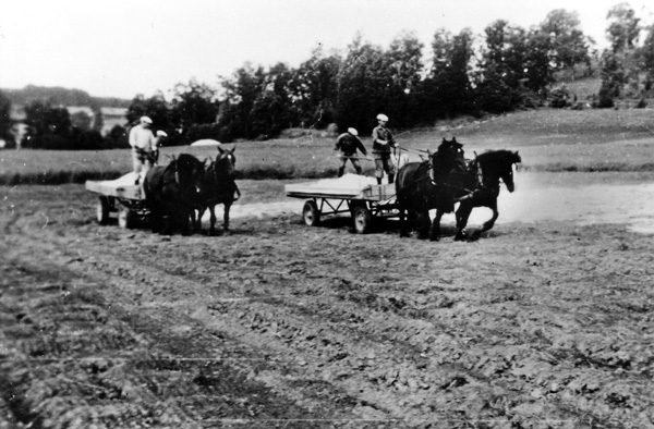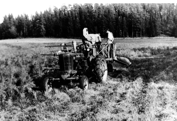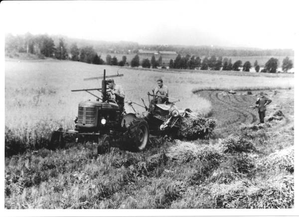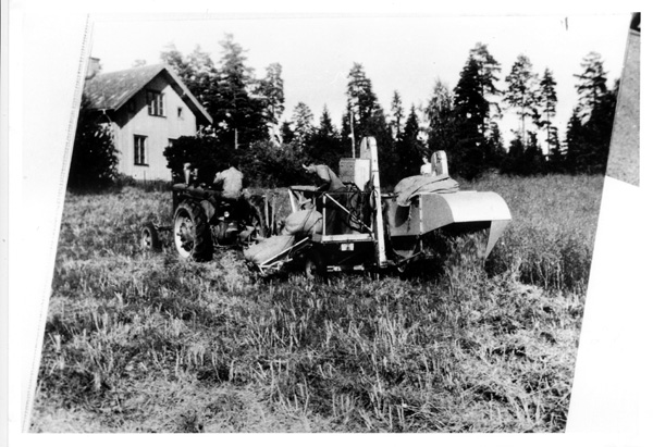 Bildtext: Reprobilder från Ogestads gårdsarkiv: Skörd av havre med traktor och självbindare. // Traktorn är IH Farmall A, ca 18 hkr, en s.k. offsettraktor där föraren satt på höger sida av motor och växellåda, som var förskjutna åt vänster så att huven inte hindrade förarens sikt framåt och ned mot utrymmet mellan fram- och bakhjul. -- Bo Johansson
