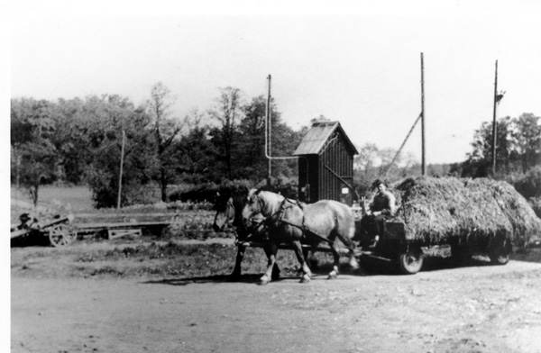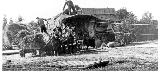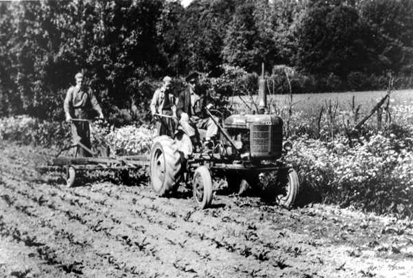 Bildtext: Reprobilder från Ogestads gårdsarkiv: Hackning av betor med traktor och bogserad radhacka. // Traktorn är IH Farmall A, ca 18 hkr, en s.k. offsettraktor där föraren satt på höger sida av motor och växellåda, som var förskjutna åt vänster så att huven inte hindrade förarens sikt framåt och ned mot utrymmet mellan fram- och bakhjul, även kallad Culti-Vision.