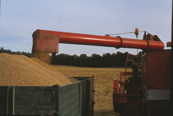 Bildtext: Tröskning med skördetröska 1978, Bertil Haraldsson. Tömning till spannmålsvagn.