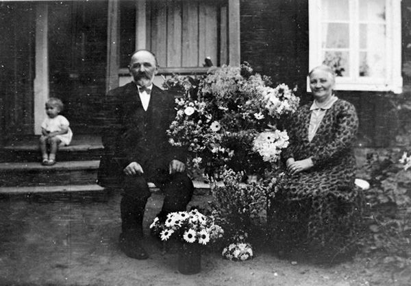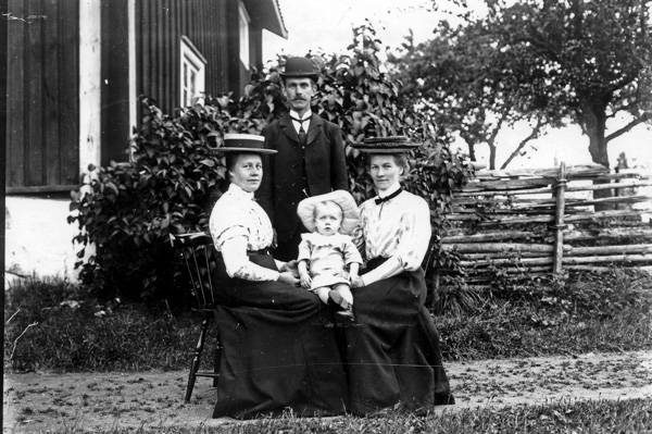 Bildtext: Bild tagen i Mulestad på släktingar till Sara Svensson i Åbäck. Sittande längst bak t.v. Emil Fransén (nån som spelte förti piano på nattstua), t.v Hustrun Klara.