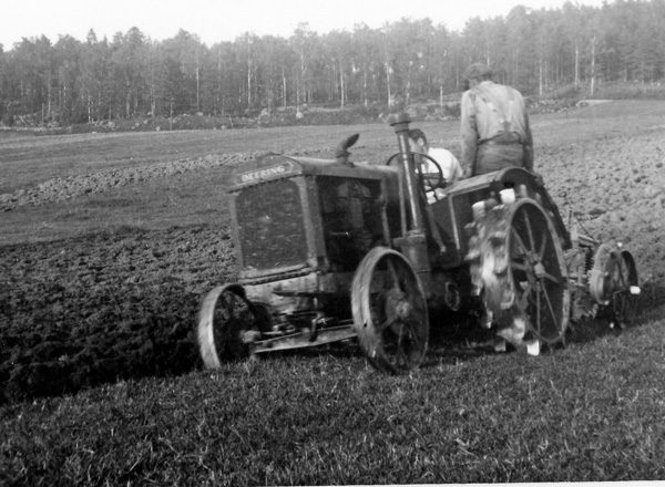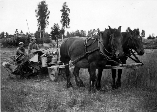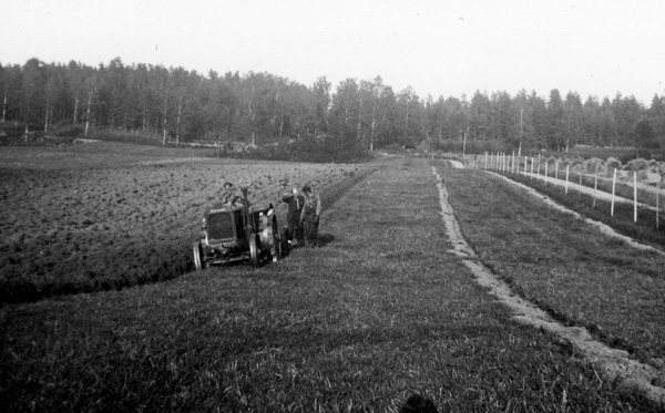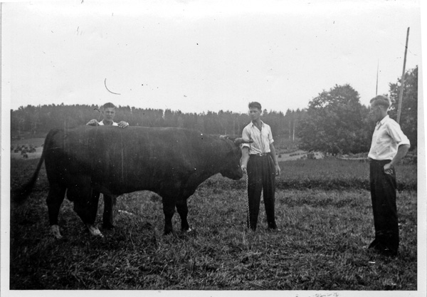 Bildtext: Lantbrukseleverna på Ogestad sommaren 1939. Från vänster Evert Pettersson, Sven Pettersson, Robert Karlsson, Georg Olsson och Harald Olsson.