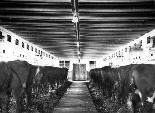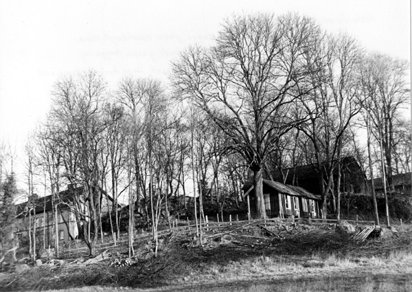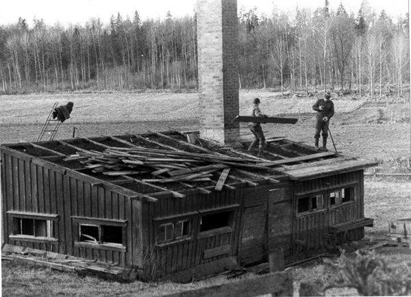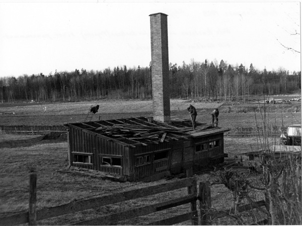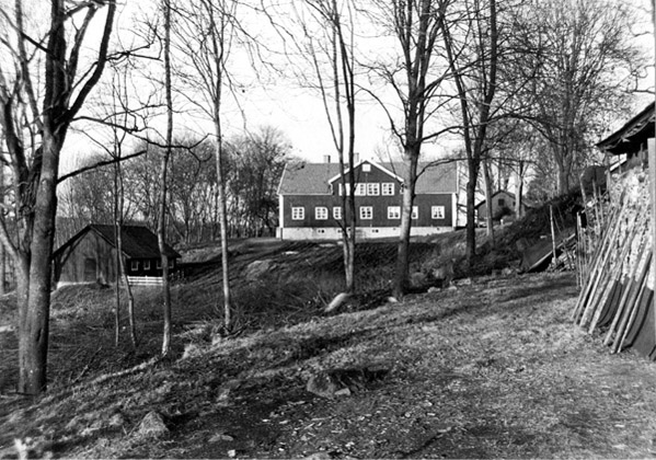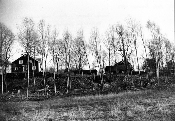 Bildtext: Ogestad. Bilden är tagen från växthusfållan. Området har gallrats genom huggning. Herrgården, hönshuset, vagnboden och magasinet.