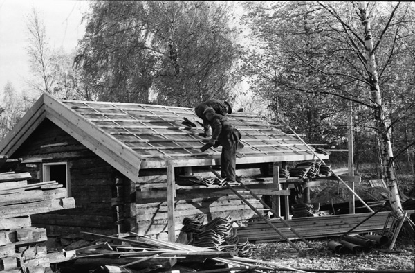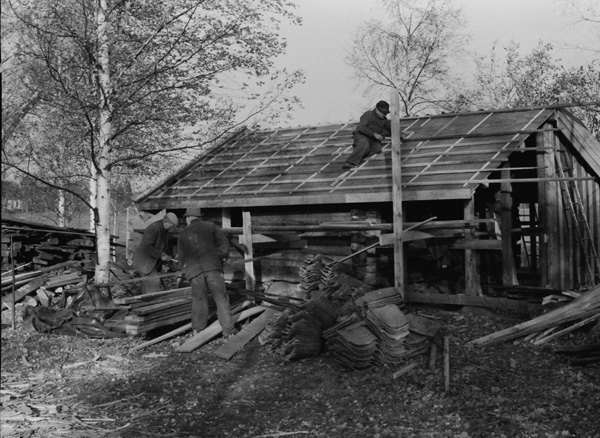 Bildtext: Blåsekolle byggs. Anton Johanson och Carl Uleaus, på taket Olle Karlsson 751029